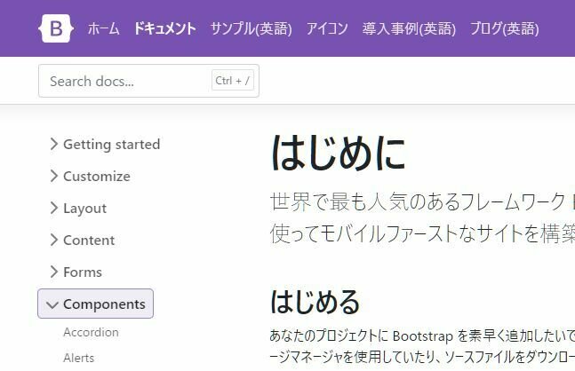 - 上記サイト(日本語の方)を開いたら、左側の一覧からの Components(コンポーネント) をクリックしてください。