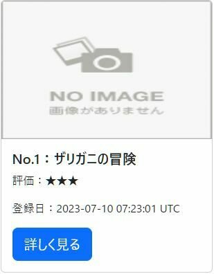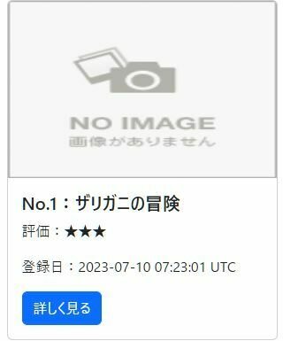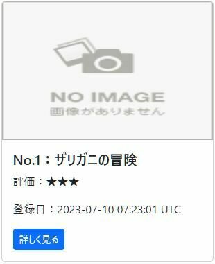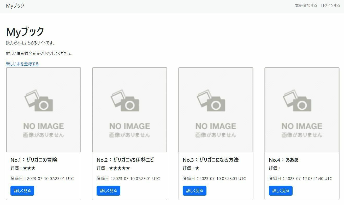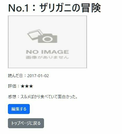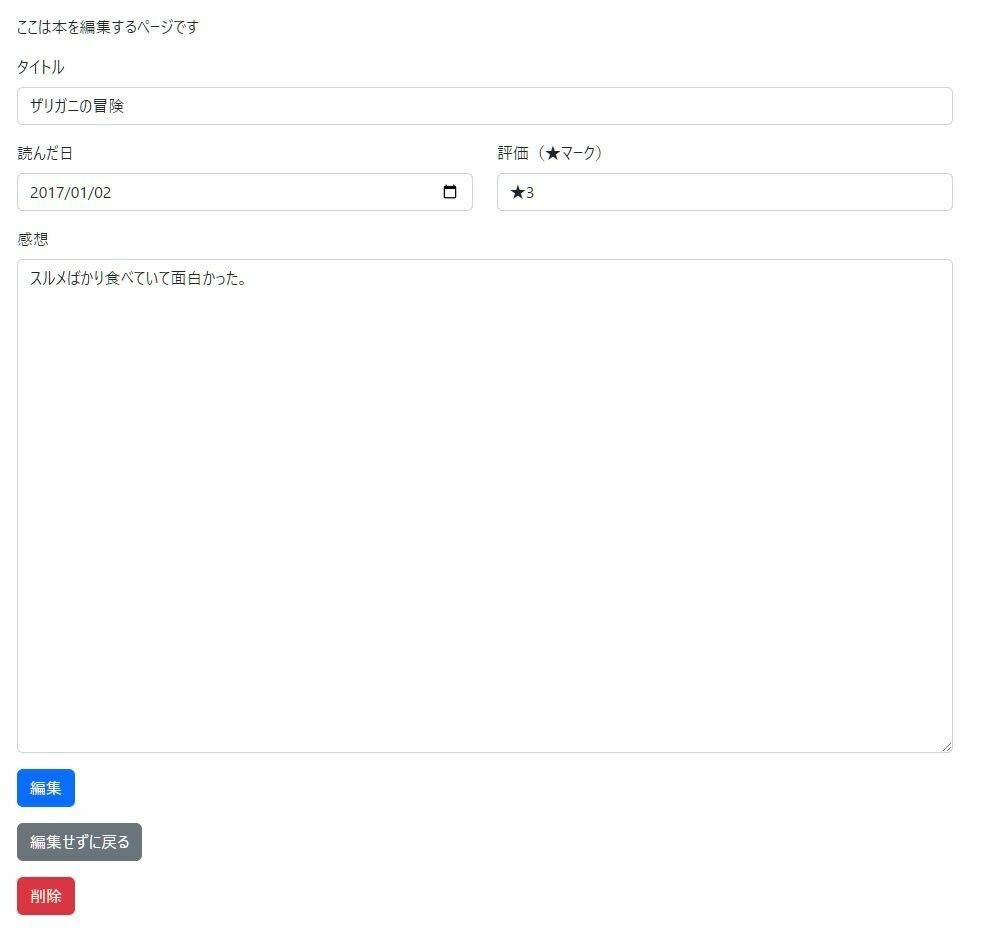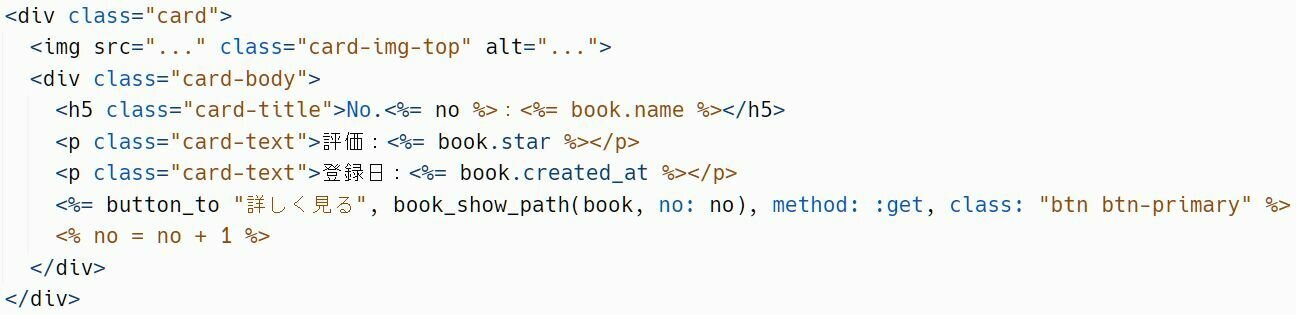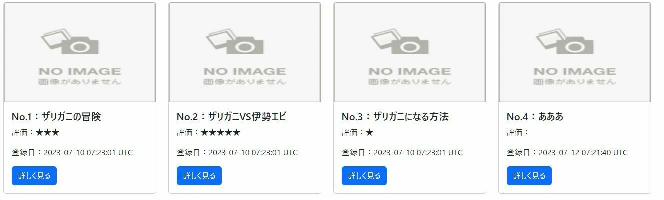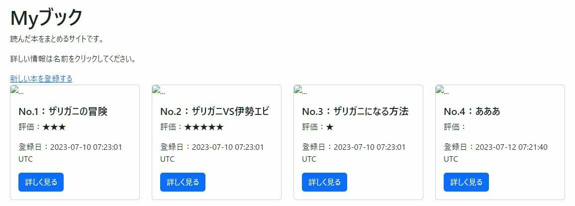 - .card-title の所には「本の名前」を、.card- text には「本の評価」にして、さらに「登録日」も追加しています。