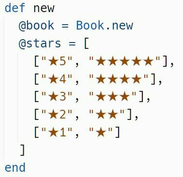 - コントローラーのnewメソッドに、以下のように @stars を作ります。
