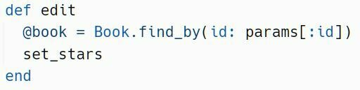 - 後は、editメソッドの @stars を作っている部分を消し、代わりに set_starsメソッド を呼び出します。次へ。