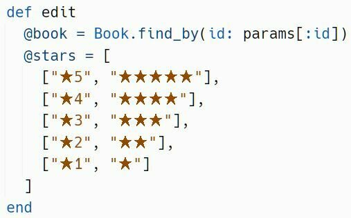 - さらに今回の場合は newアクションと editアクションの時だけ、set_stars を実行してほしいので「 only: [:edit, :new] 」をつけています。