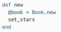 - この before_action(ビフォーアクション)を設定しておくことによって、new と edit の時は自動で set_stars が実行されるので、それぞれのメソッドは以下のようになります。