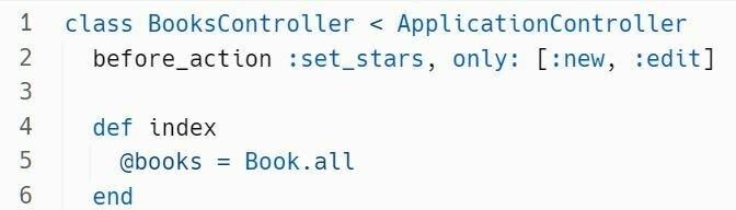 - 例えば「 before_action :set_stars 」だと、「何かアクション(メソッド)が実行される"直前"に、必ず set_stars を実行する」という意味になります。