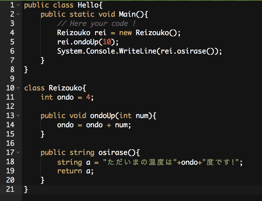 - クラス名(上では[ Reizouko ])は、必ず最初の文字を大文字にするようにしましょう(rは✕、Rは◯)(小文字でもプログラムは動きますが、大文字にしておけば見やすいコードになります。また、【クラス名の頭文字は大文字】と業界の常識になっていますので、絶対に大文字にしておきましょう)