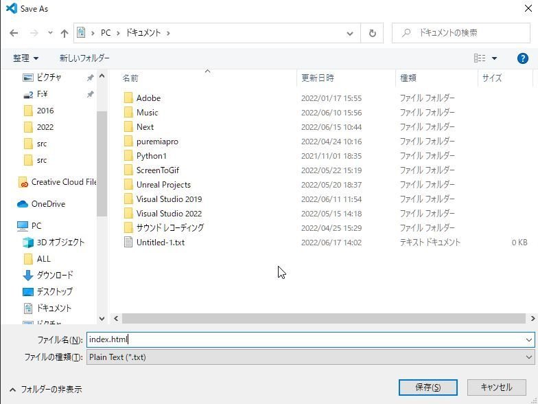 画面下の「ファイル名」のところを「index.html」にしてください。※元々書かれている名前は消してください。
