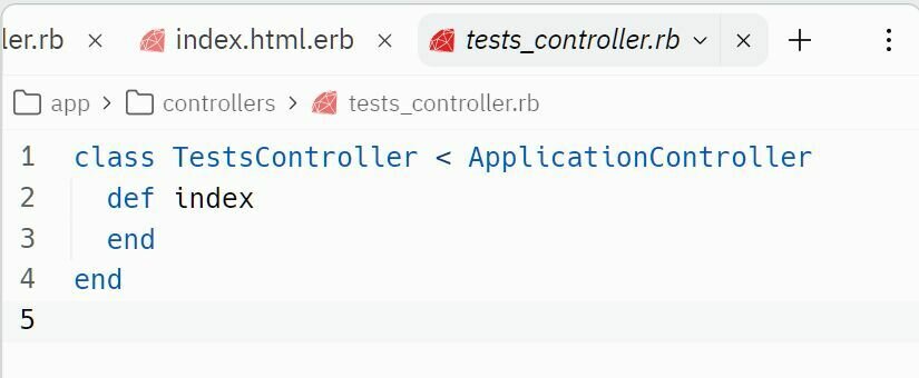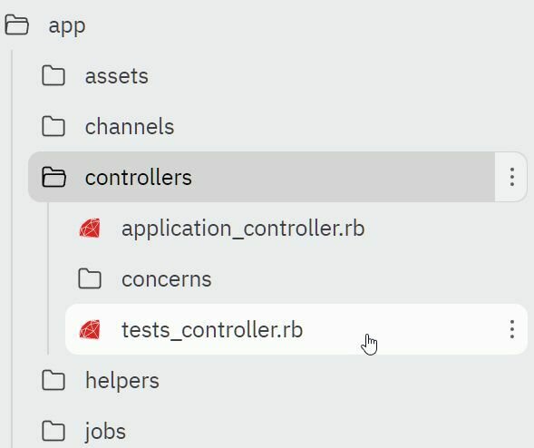 - controllers フォルダが見つかったら、その中の「tests_controller.rb」というファイルをクリックしてください。