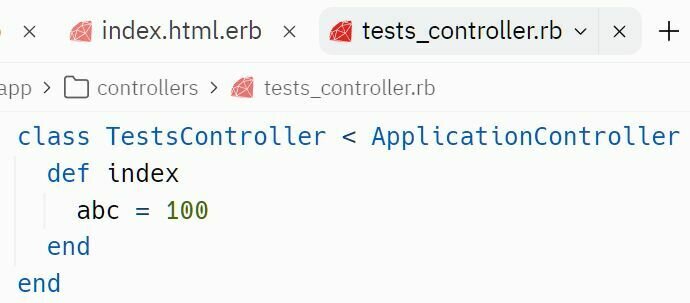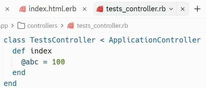 <% end %>- では、コントローラーのファイルを探し、そこに変数を追加しましょう。