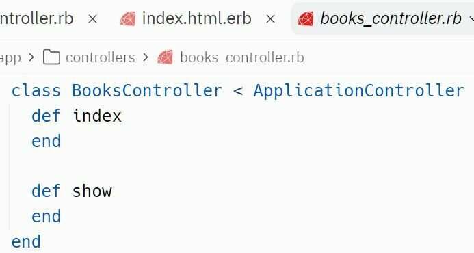 - 【 app/controllers/books_controller.rb 】ファイルを開きましょう。