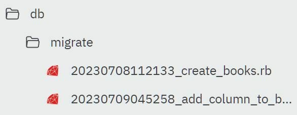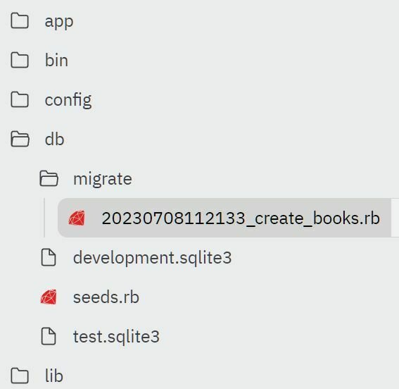 - そのdbフォルダの中に、migrate というフォルダがあり、その中に「日付のような数字_create_books.rb」というファイルがありますので、それをクリックしてください。(日付のような数字、の部分は作った日などによって異なります)