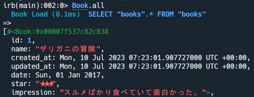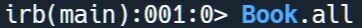 - 次に Book.all でbooksテーブルのデータをすべて表示させます。