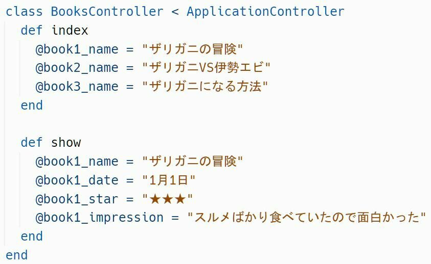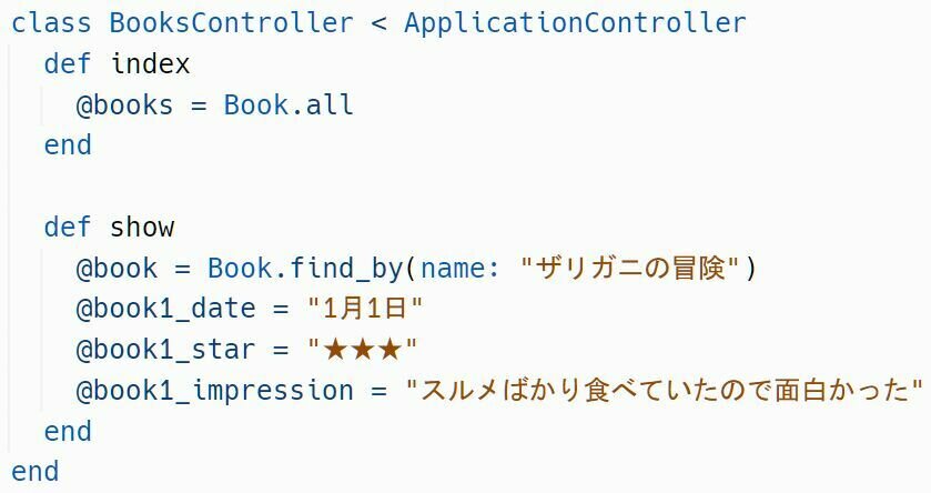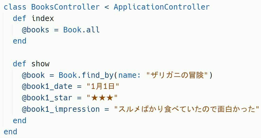 - 変数の名前(@book)を単数形にしているのも、1つのレコードだけだからです。