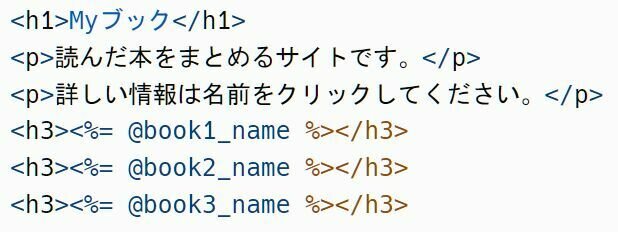- 本のタイトルが消えていますが、これはコントローラーで、@book_name という変数を削除して、@book に変えたので当然です。