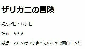 - さて、「本の名前」だけはデータベースから表示させることが出来ましたが、他のデータ【読んだ日】【評価】【感想】はデータベースを使っていません。
