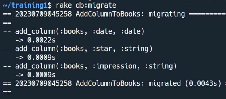 - まず、現在 bookモデル には name というカラムしかありません(タイムスタンプは除く)ので、最初にしなくてはいけないことは【カラムの追加】です。