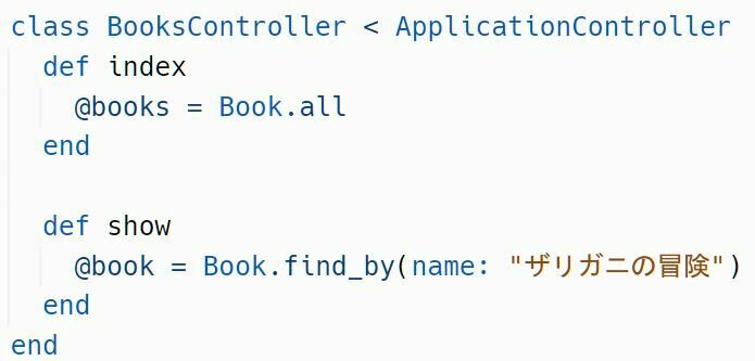 - Book.all は、全部のレコードを持って来るメソッドでしたが、【.find_by】は1つのレコードのみです。ここ注意です。